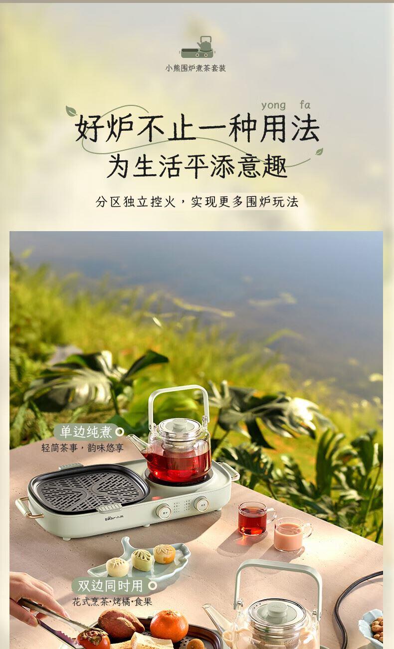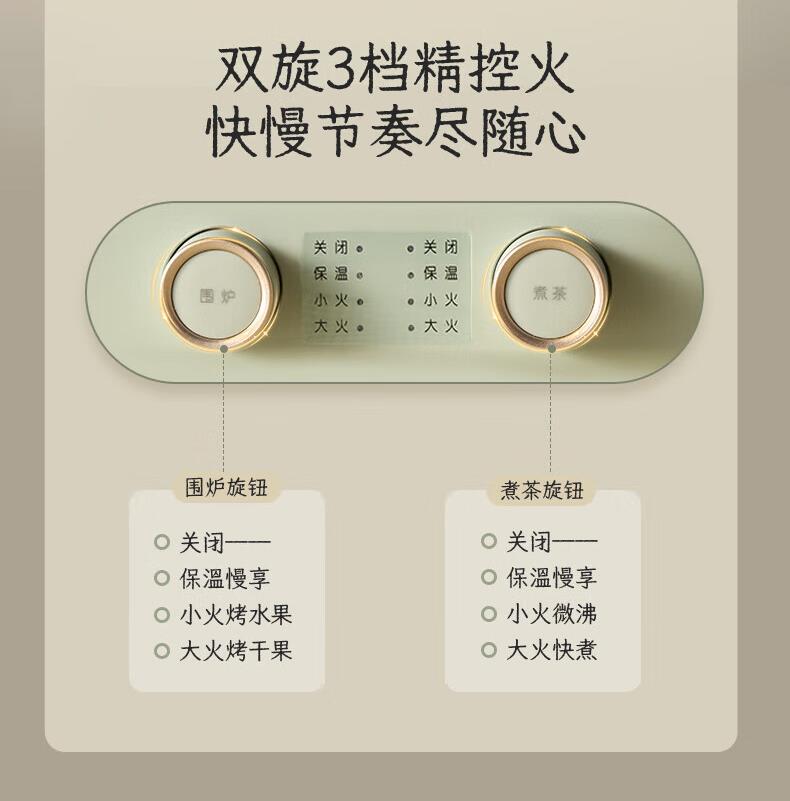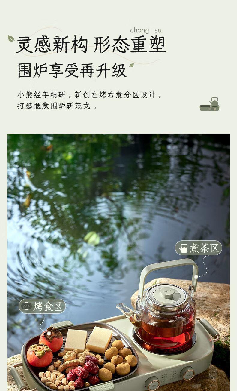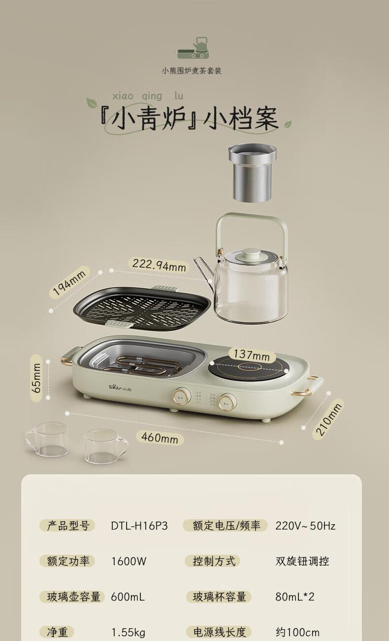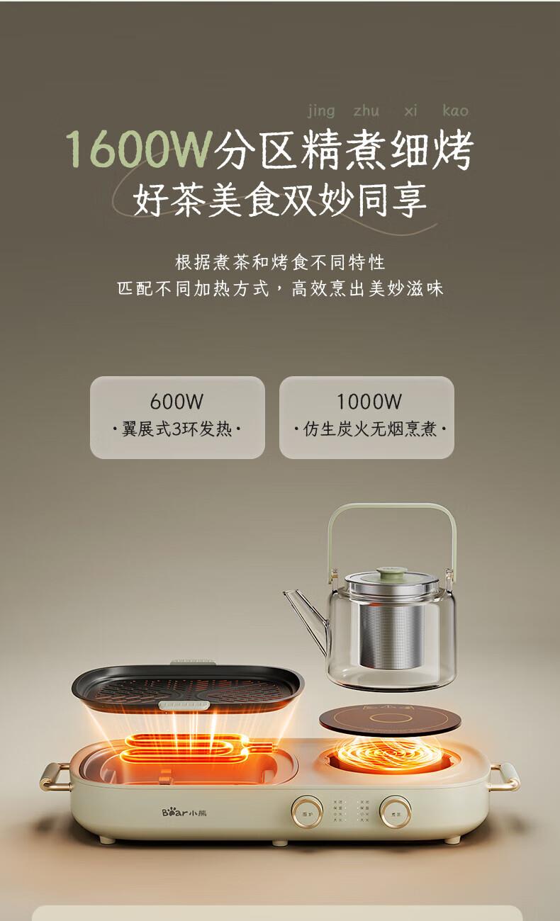 额定功率 1600W 产品重量 1.55KG 包装尺寸 505*270*240mm 1.双灶规划,快煮茶+慢烤分区同步进行; 2.1600W大功率,快煮茶; 3.分区双控,快慢可同频; 4.标配烤网茶壶茶杯,围炉煮茶更专业; 5.容量更大,单边使用满足个人,同频满足大聚会