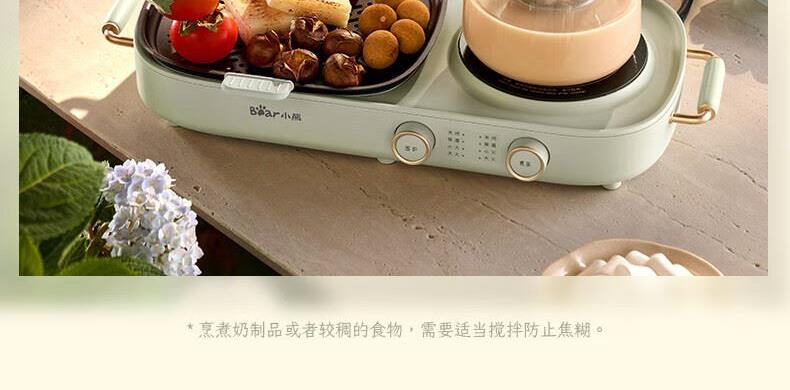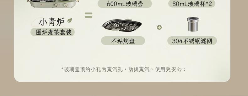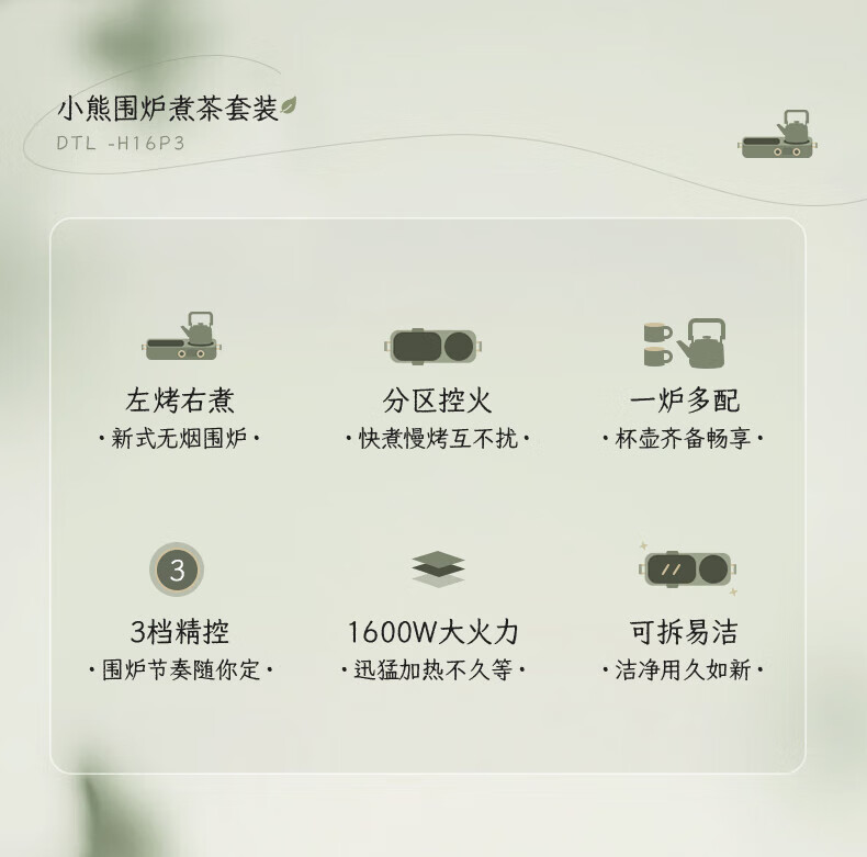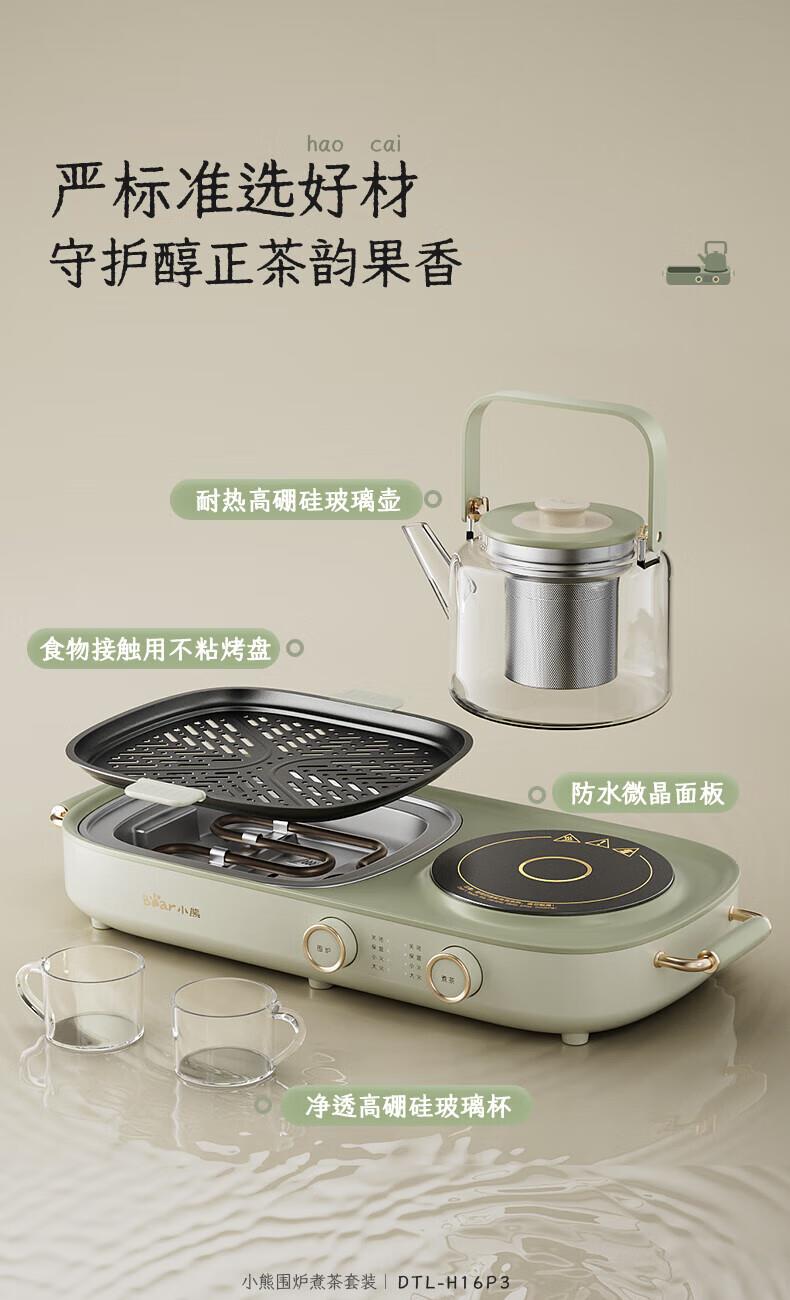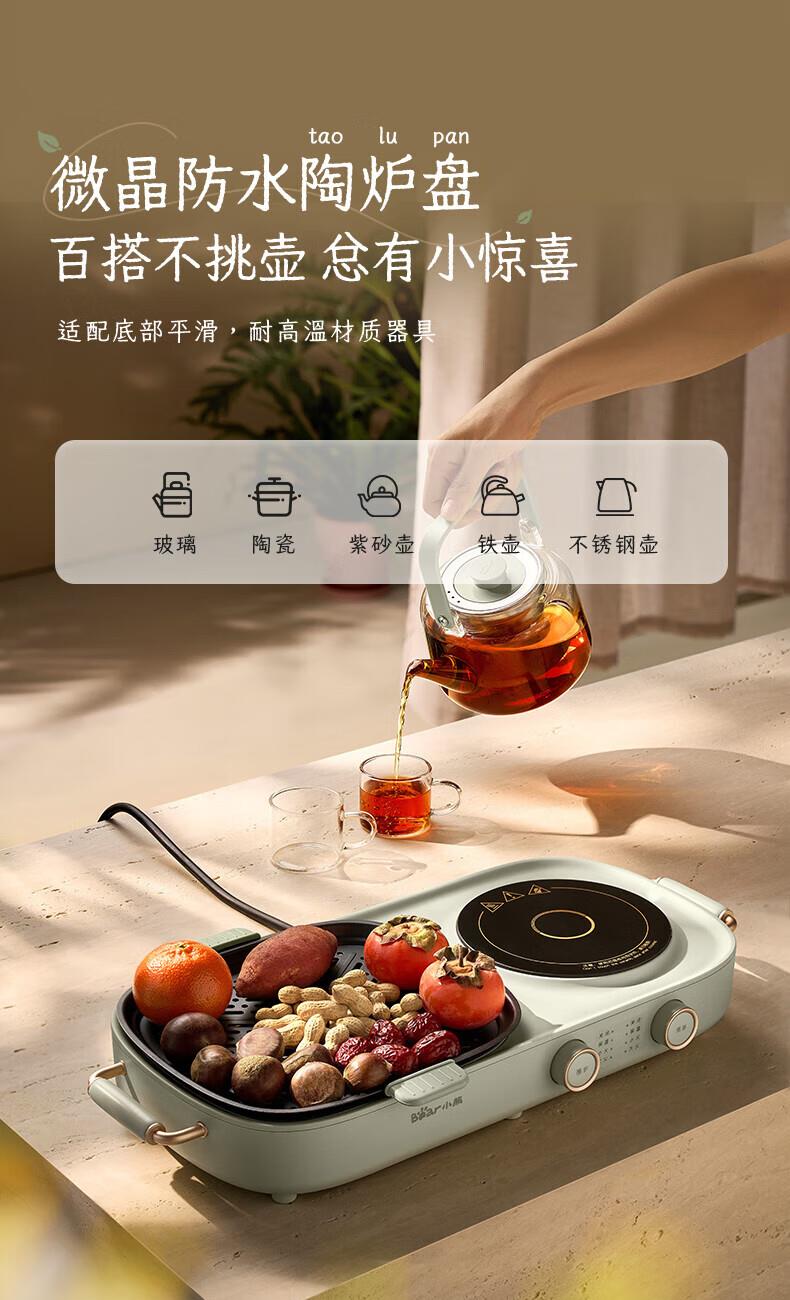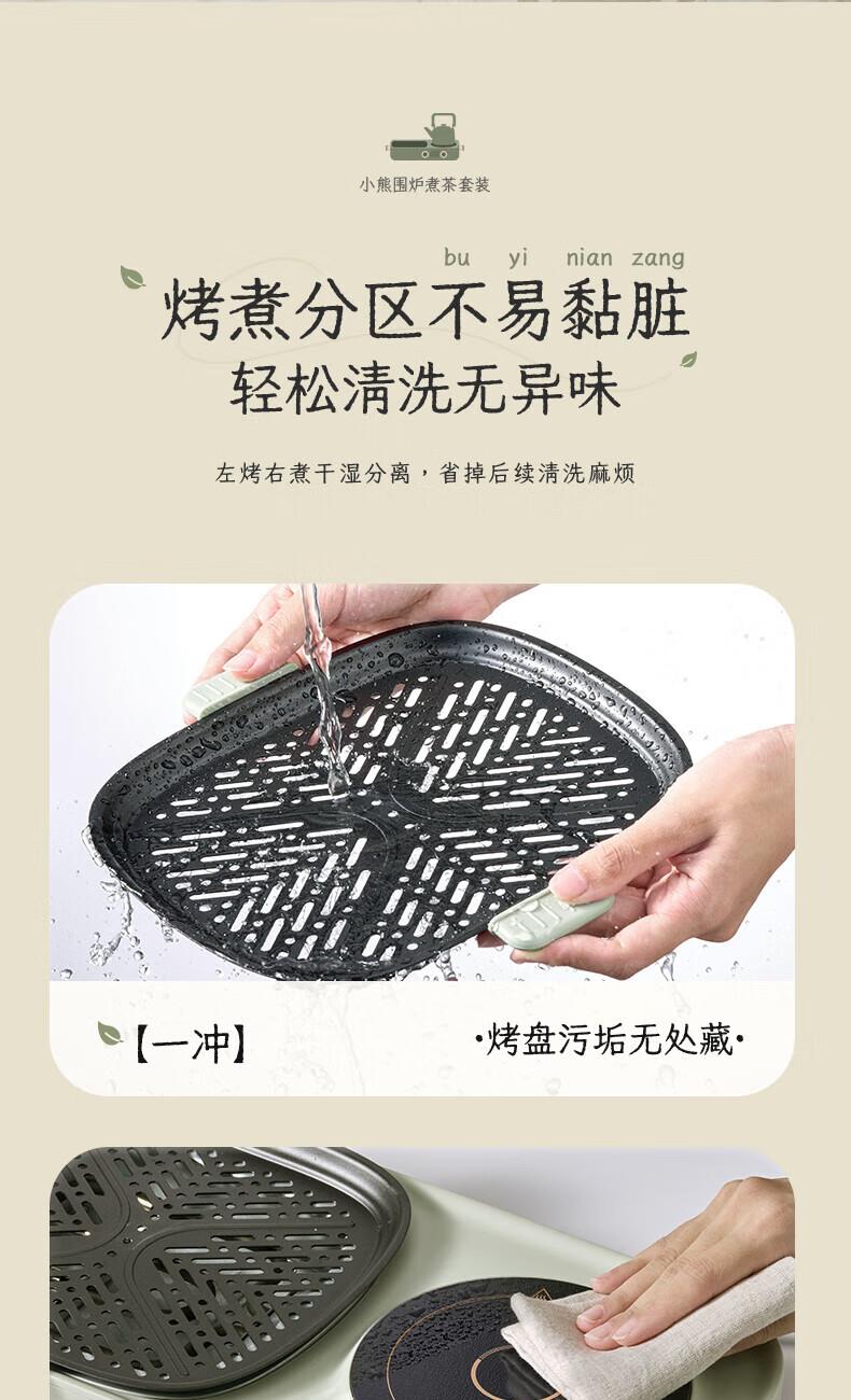 额定功率 1600W 产品重量 1.55KG 包装尺寸 505*270*240mm 1.双灶规划,快煮茶+慢烤分区同步进行; 2.1600W大功率,快煮茶; 3.分区双控,快慢可同频; 4.标配烤网茶壶茶杯,围炉煮茶更专业; 5.容量更大,单边使用满足个人,同频满足大聚会