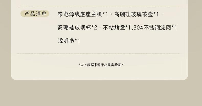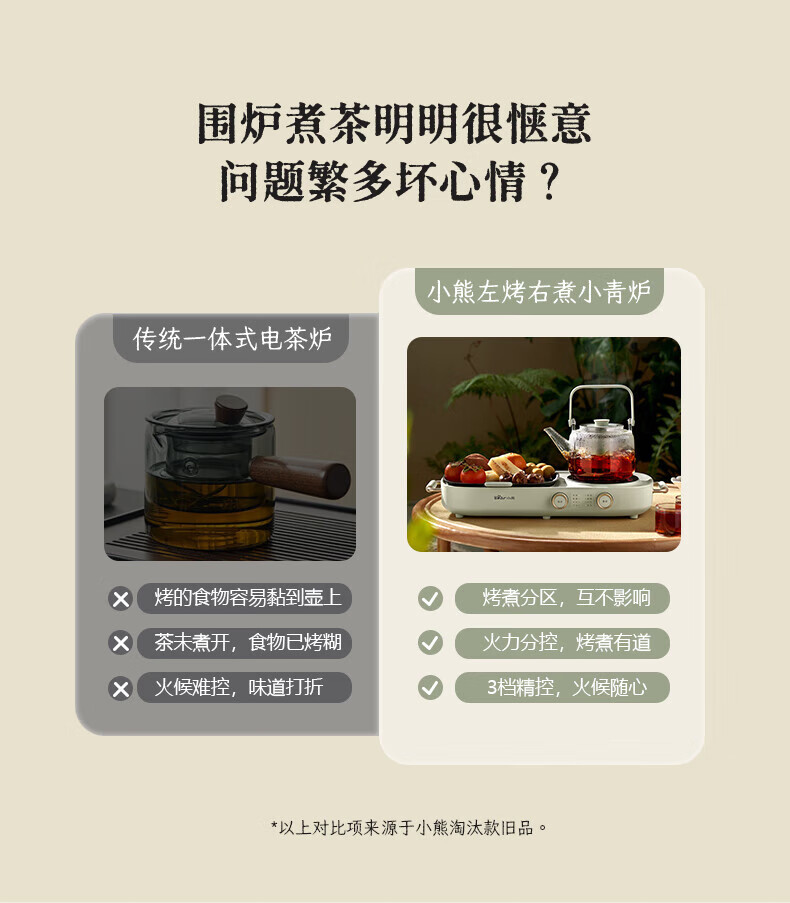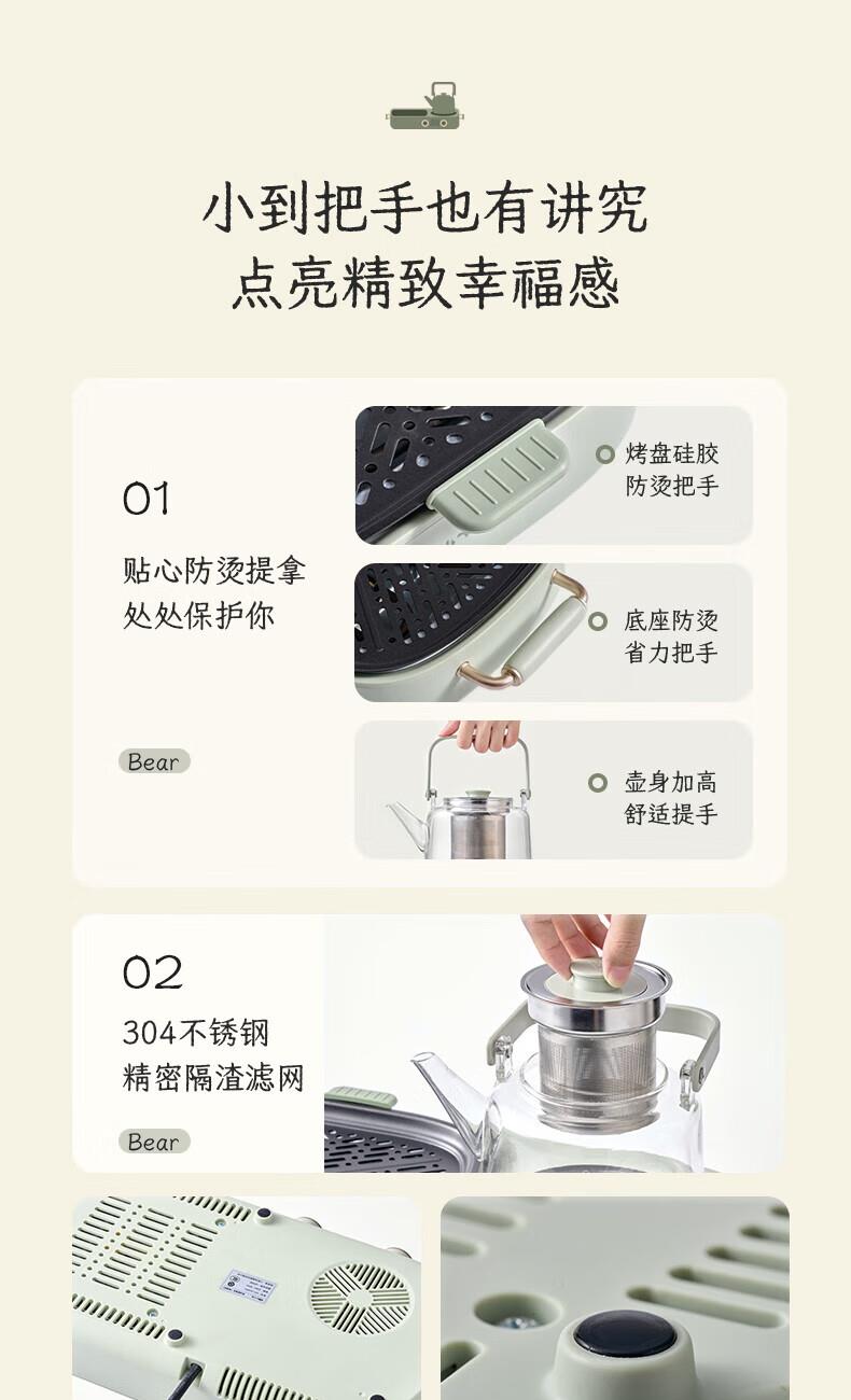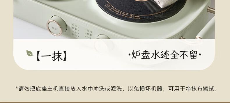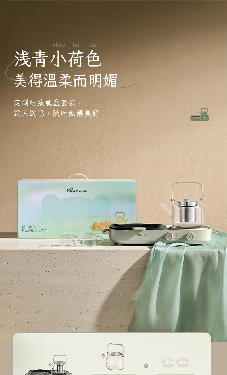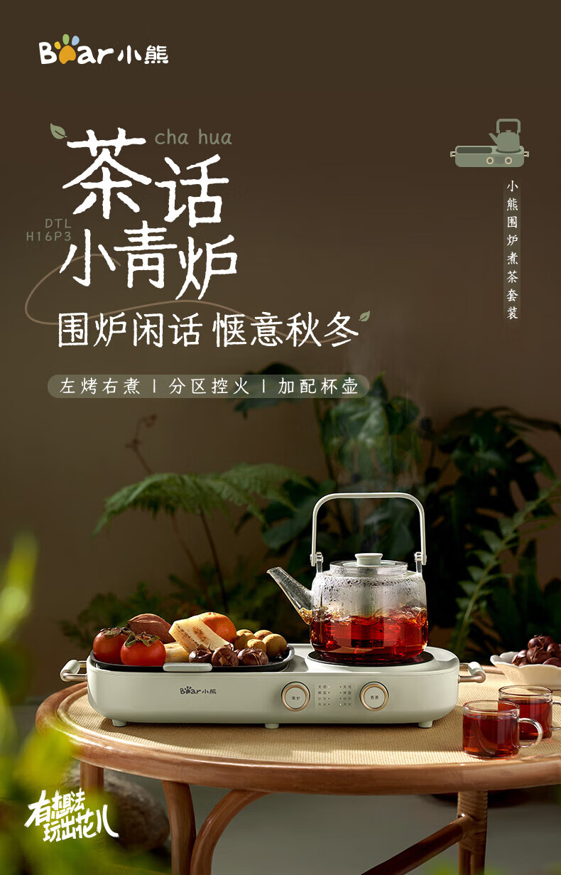 额定功率 1600W 产品重量 1.55KG 包装尺寸 505*270*240mm 1.双灶规划,快煮茶+慢烤分区同步进行; 2.1600W大功率,快煮茶; 3.分区双控,快慢可同频; 4.标配烤网茶壶茶杯,围炉煮茶更专业; 5.容量更大,单边使用满足个人,同频满足大聚会